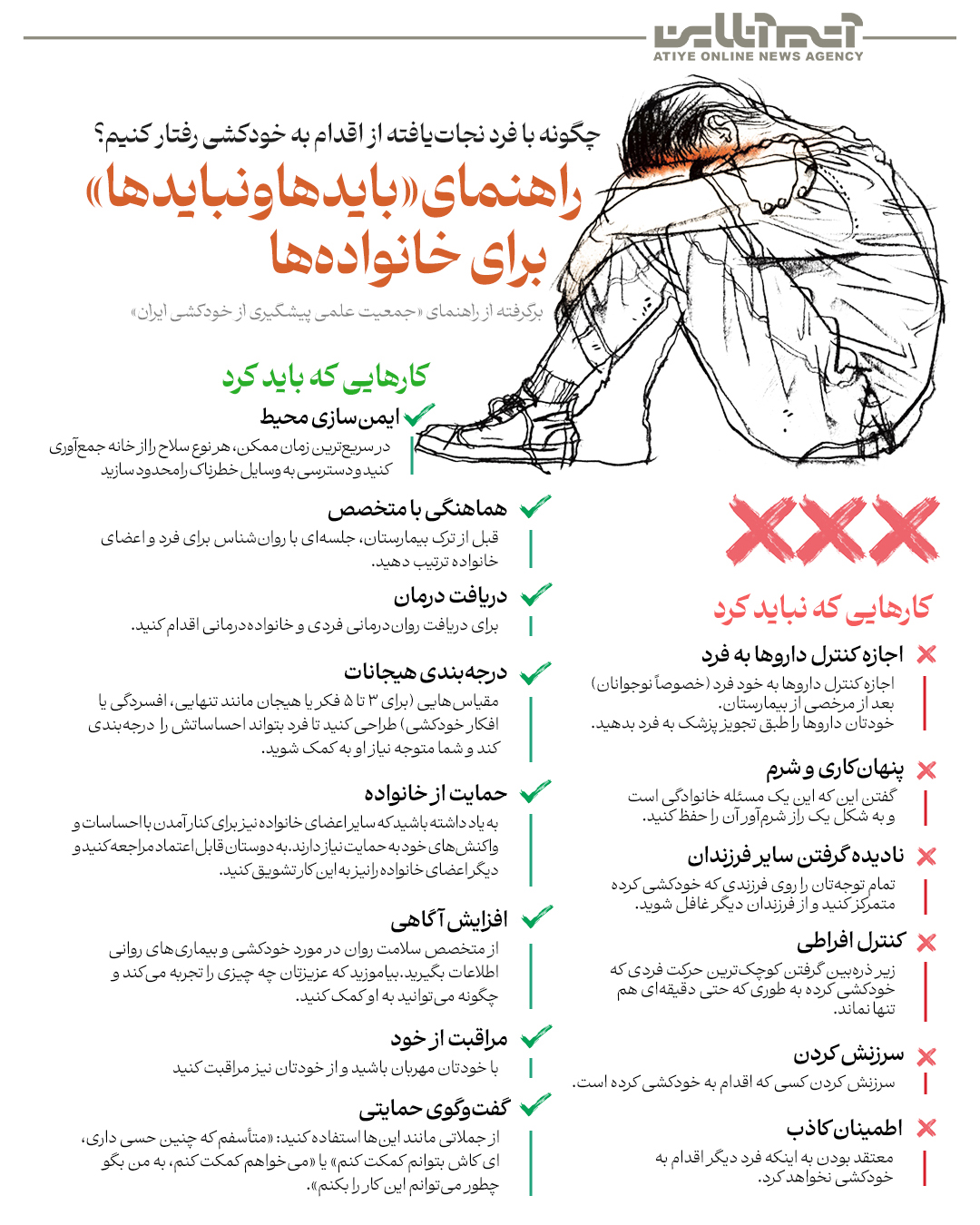 بسیاری از ما نمیدانیم که باید چگونه با افراد نجاتیافته از خودکشی رفتار کنیم. این اینفوگرافیک که برگرفته از راهنمای «جمعیت علمی پیشگیری از خودکشی ایران« است، بایدها و نبایدها را توضیح میدهد.